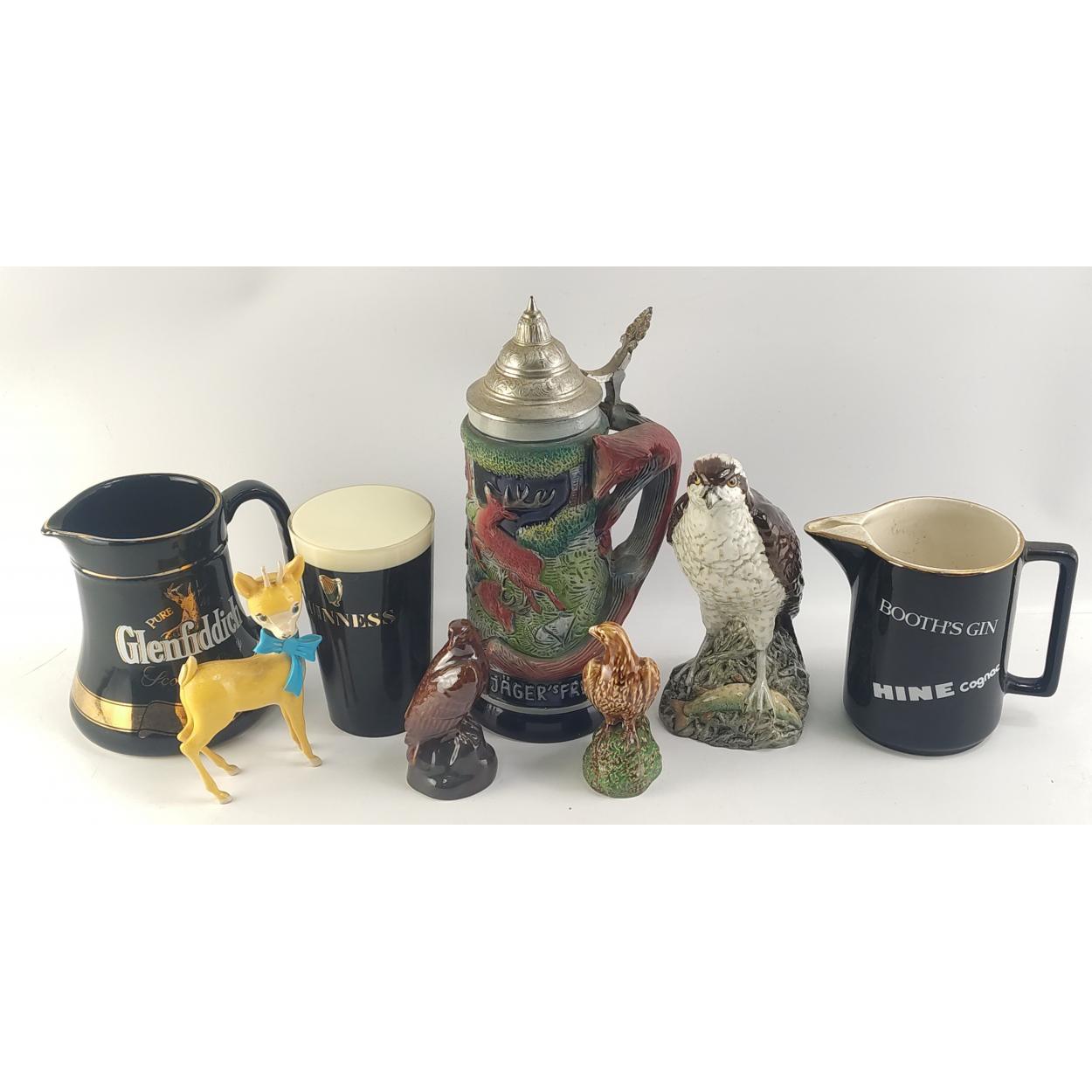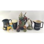BREWERIANA lot. To include German lidded Stein, Guiness and other advertising, Water Jugs etc. Beswick decanter bottle.
