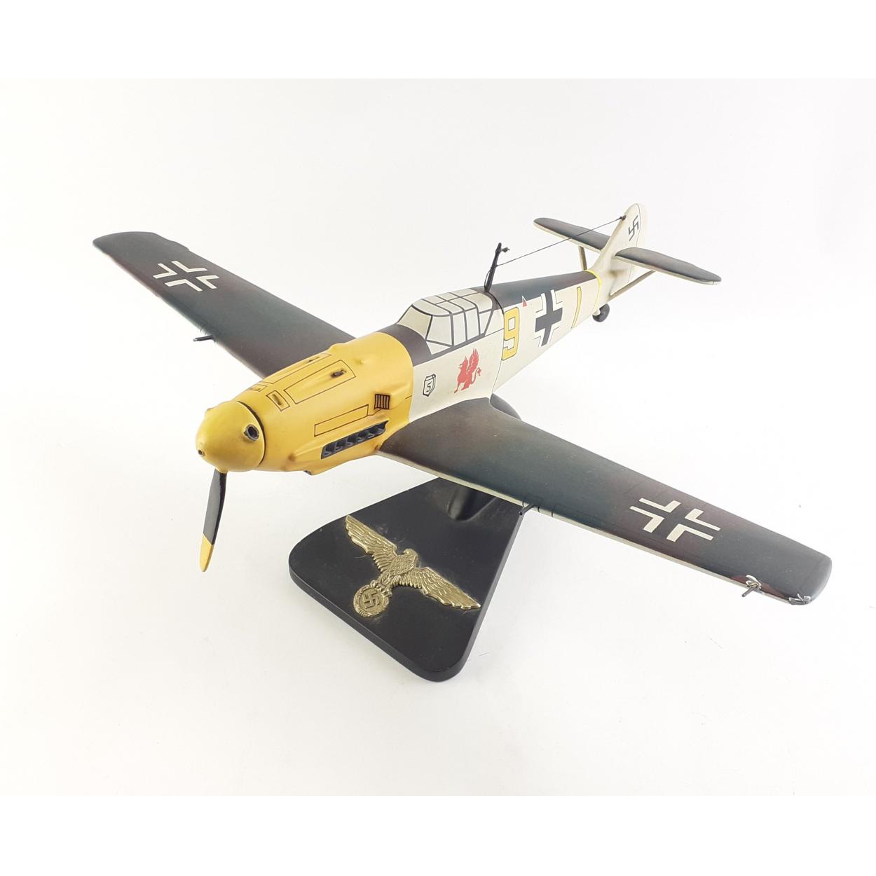 A large wooden model of a Messerschmitt Bf 109 on plinth. Damage noted to propellors 44cm Wing span