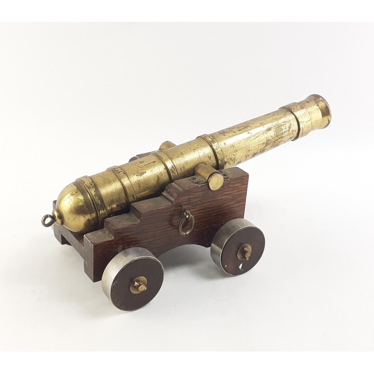 A wonderful desktop Canon on Carriage. Solid brass cast model and wooden base. Total length 30cm.