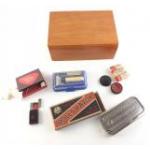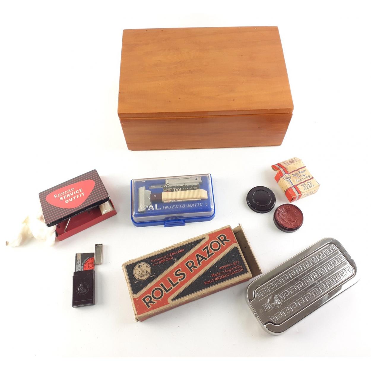 A useful lidded small box with contents. Rolls Razor, Ronson Service outfit, Bakelite blade holder and others