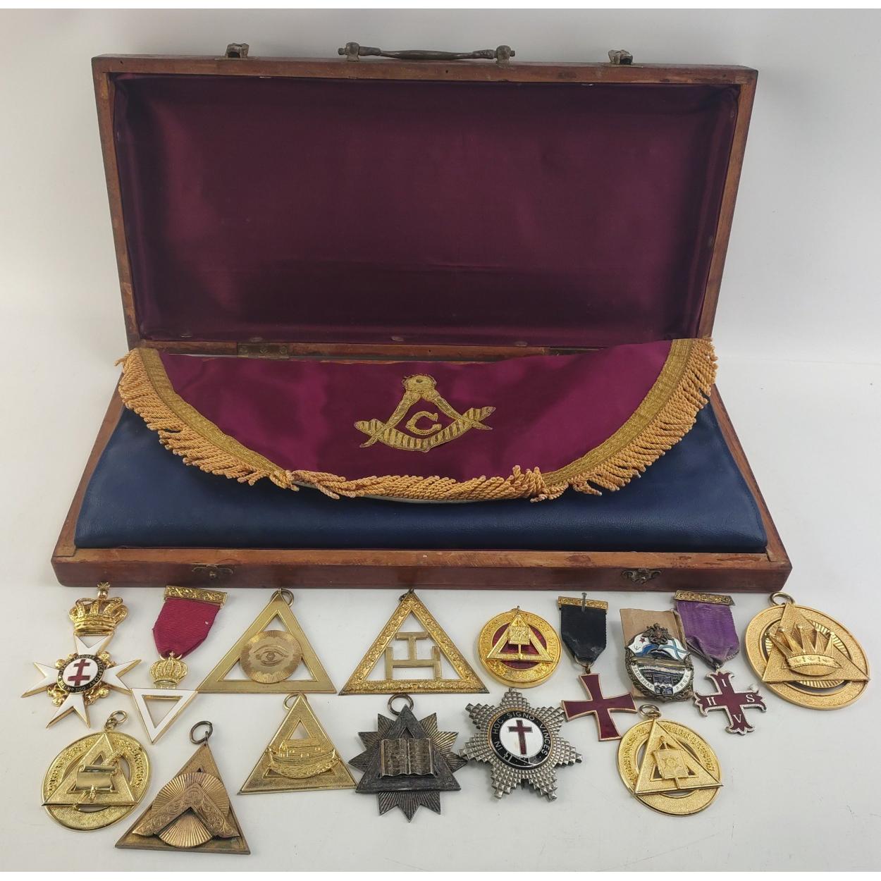 A cased MASONIC apron with a collection of gilt metal insignia and Jewels..