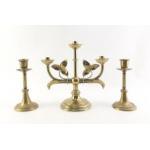 An attractive three branch brass candelabra with leaf motif finish, 26cm at centre. Also a pair of antique victorian brass candlesticks 19cm approx.