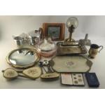 A good mixed lot. Dressing table set with tray, barometer, oil style lamp, plated rim crackle style bowl, barometer, Picquot ware, mirrors and others.