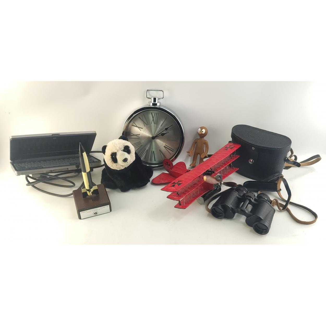 A mixed lot. Fokker model, Clock, Binoculars, Panda cuddly toy, untested small laptop etc.