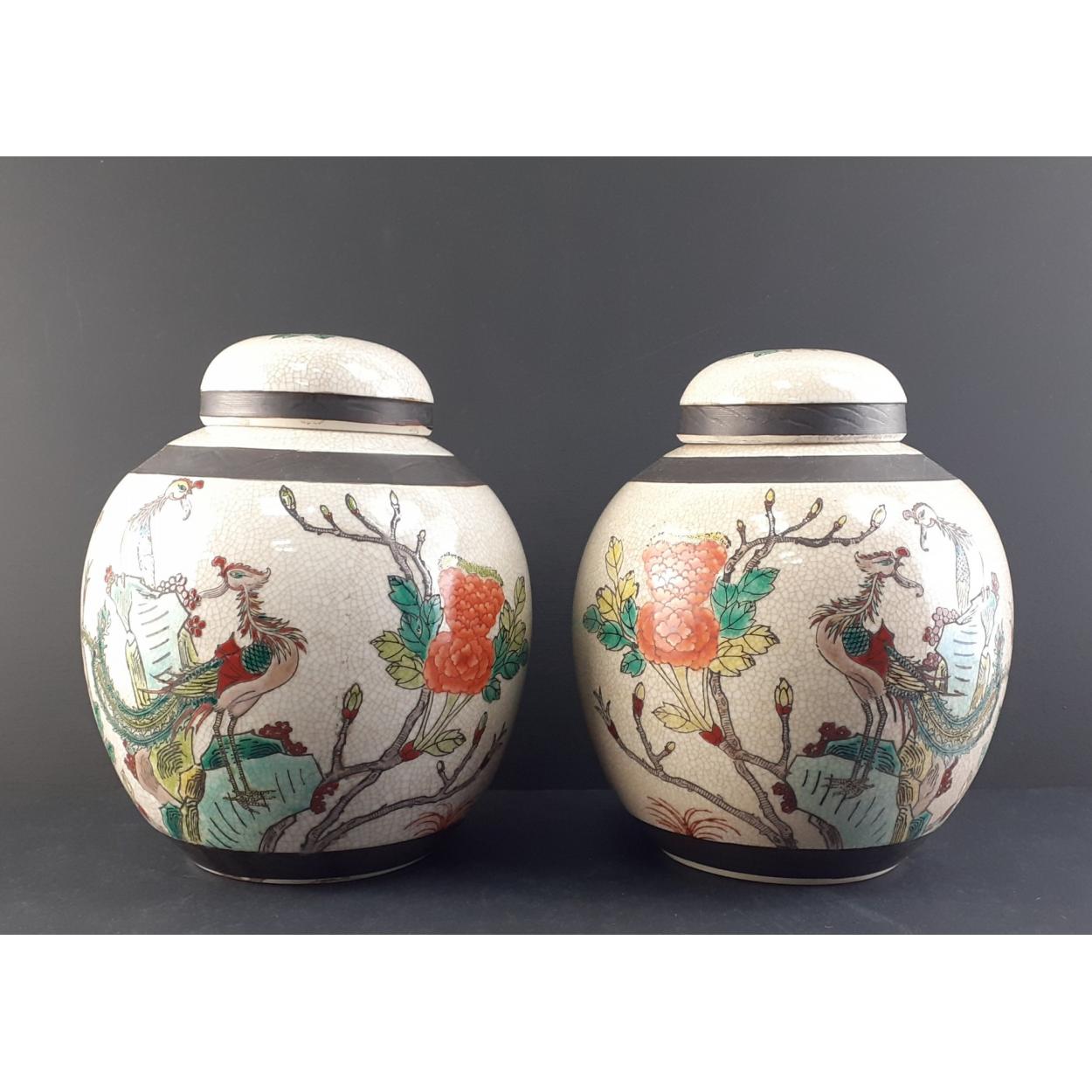 A pair of oriental lidded Ginger Jars with atractive bird and insect motifs. Each stands 20cm tall and both in good undamaged condition.