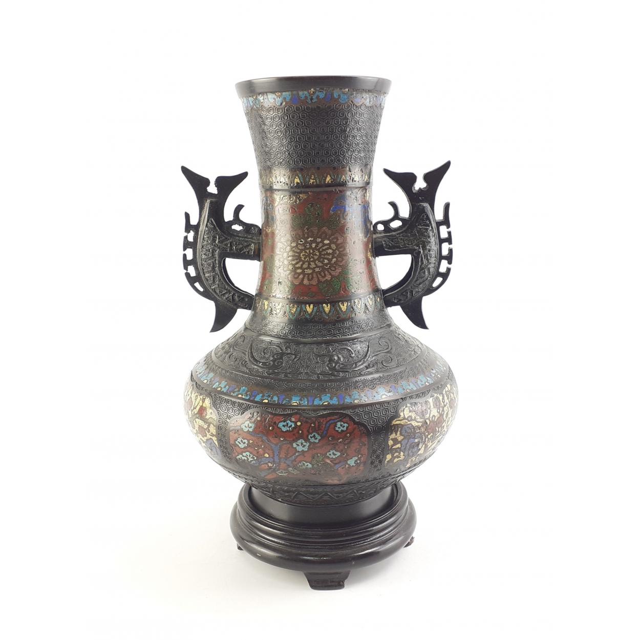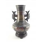 A large Cloissone vase with 'Dragon' style handles. Stamped made in Japan. Stands 35cm tall on plinth.