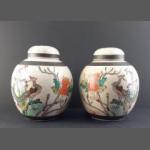 A pair of oriental lidded Ginger Jars with atractive bird and insect motifs. Each stands 20cm tall and both in good undamaged condition.