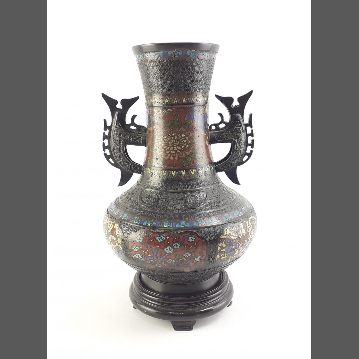 A large Cloissone vase with 'Dragon' style handles. Stamped made in Japan. Stands 35cm tall on plinth.