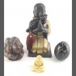 A kneeling Buddah, a small bone Buddah, a carved wooden shy man and a modern replica Faberge egg. four interesting pieces. The largest 24cm tall.