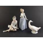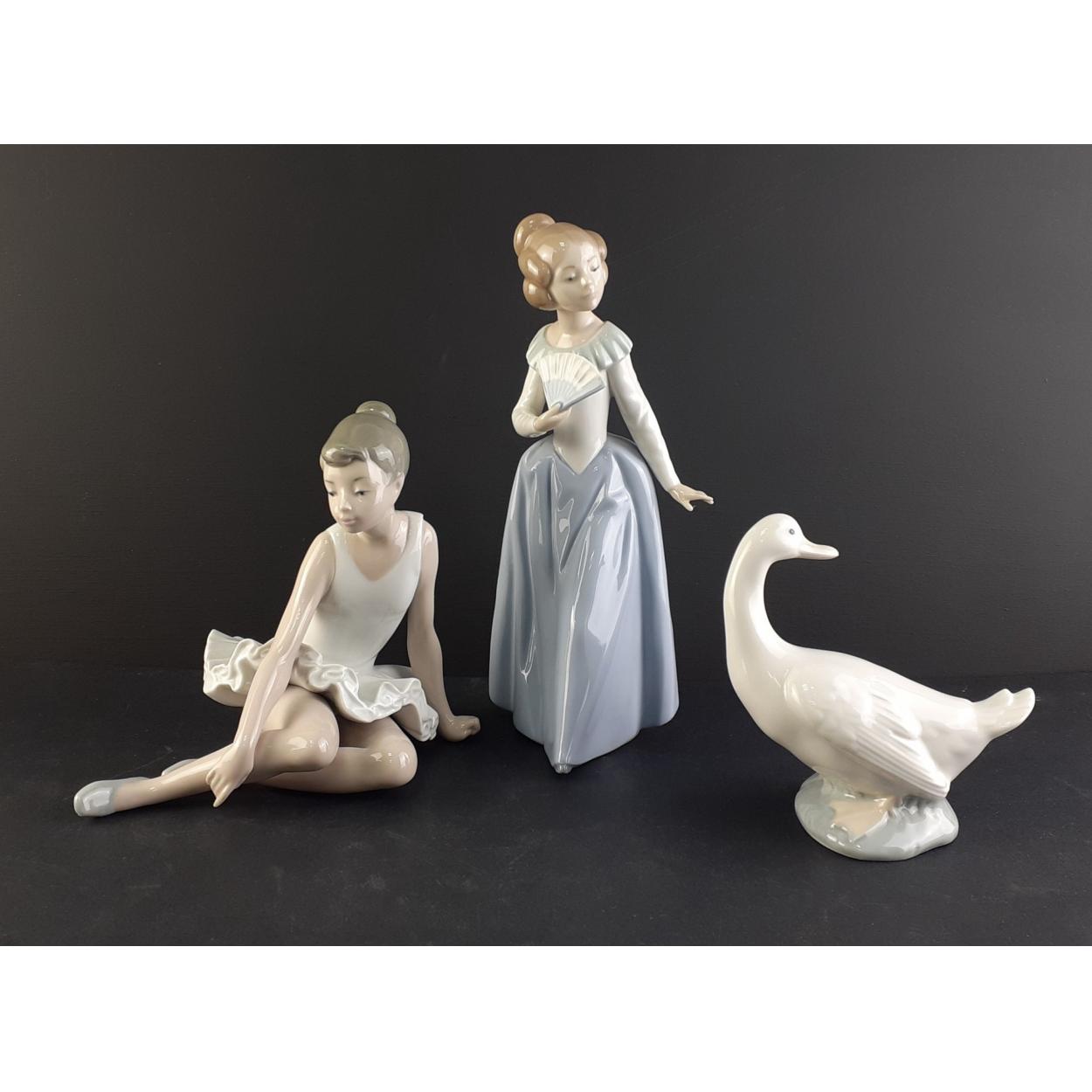 NAO Three lovely models in good condition. Lady with fan, Ballerina, Duck. All undamaged.