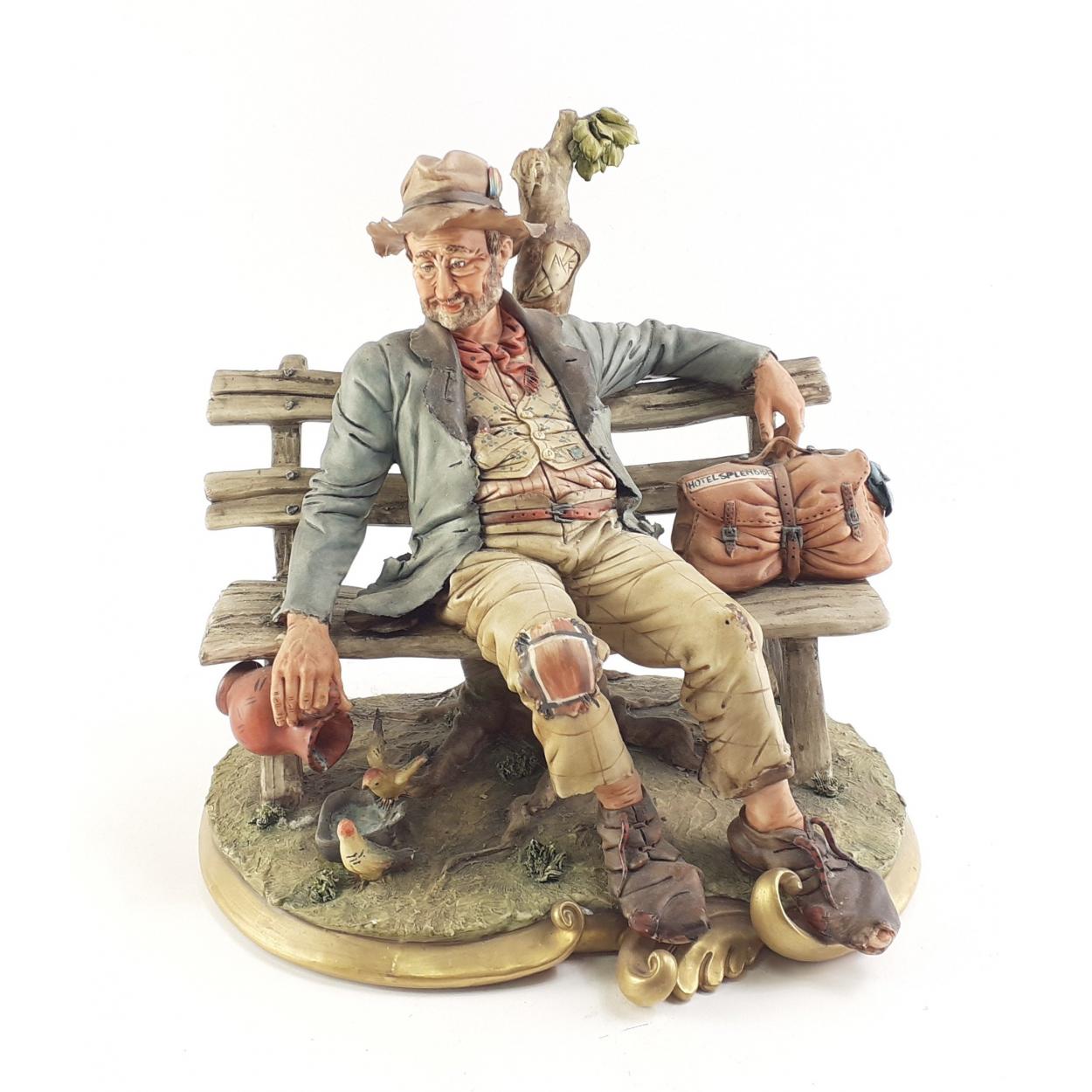 CAPO DI MONTE figure of a humorous Tramp on a bench. Stands 25cm tall. Minor damage noted to extremities on hat.