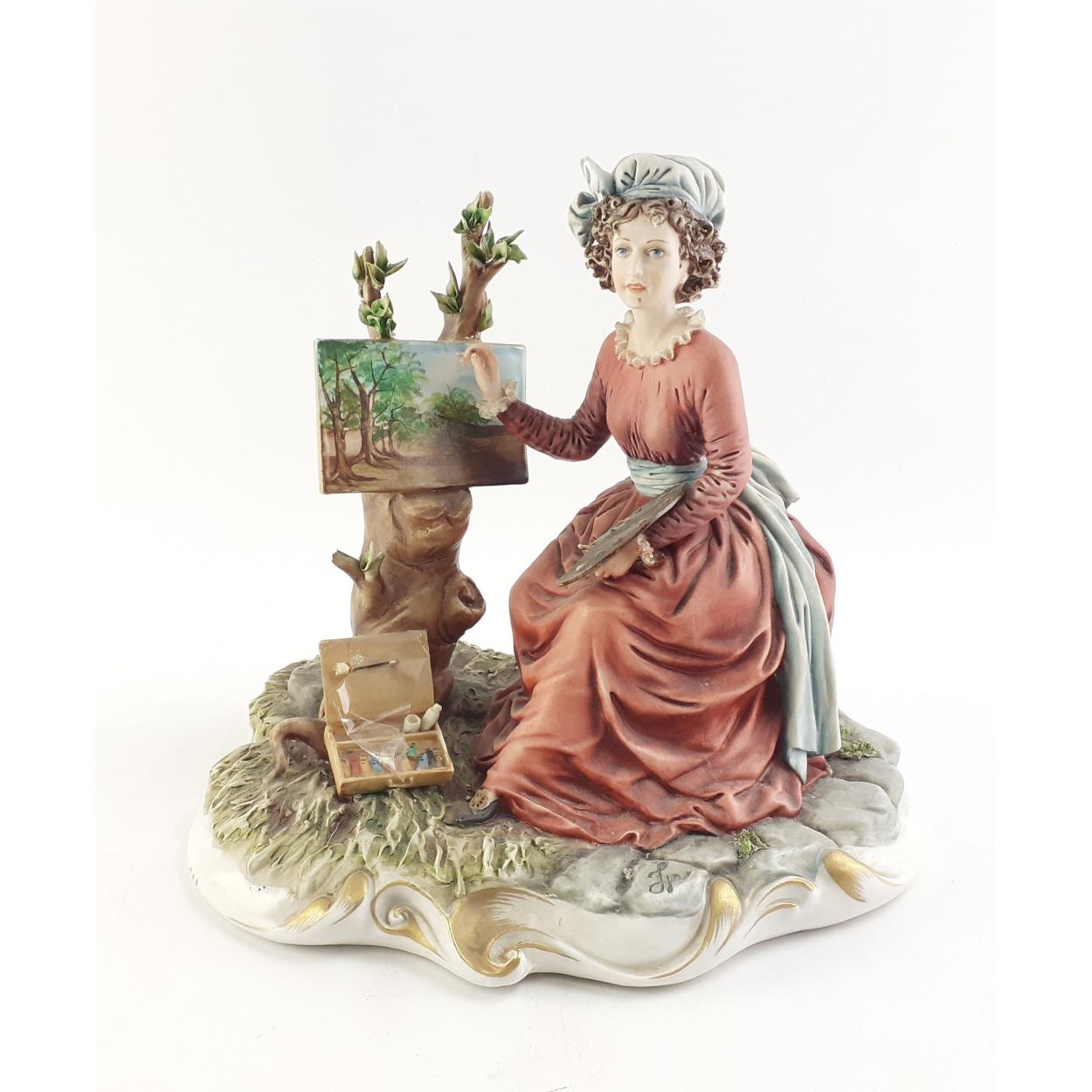 CAPO DI MONTE figure of a lady atist. A very pretty and more unusual piece. Stands 22cm tall. Good overall condition. Paint brush is loose from hand but is present.