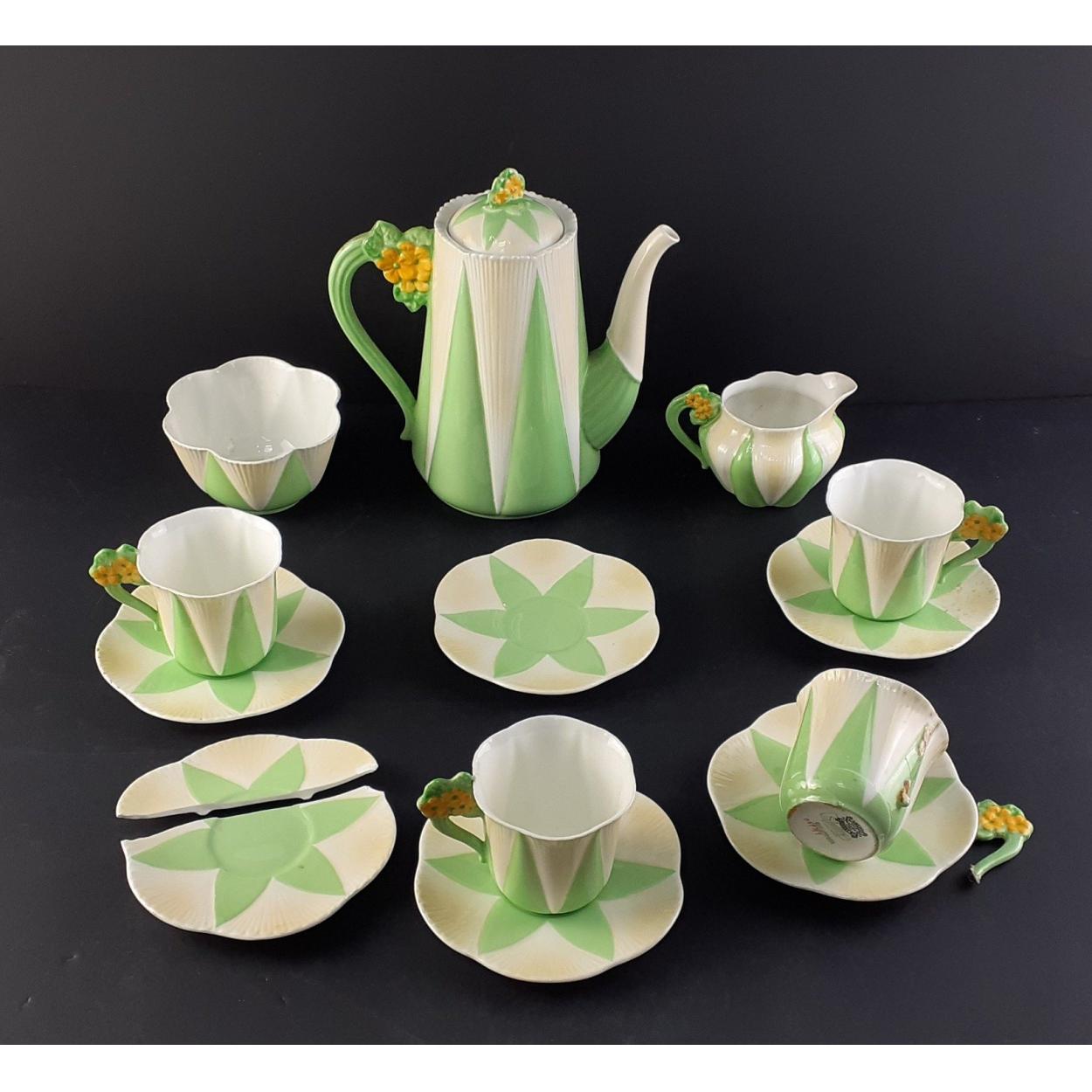 SHELLEY Bone china Apple Green part coffee service. Comprising Teapot with lid, Sugar & Cream, these three pieces in excellent undamaged condition. Three good teacups and one with detached handle. Five good saucers and one broken. A beautiful part service.