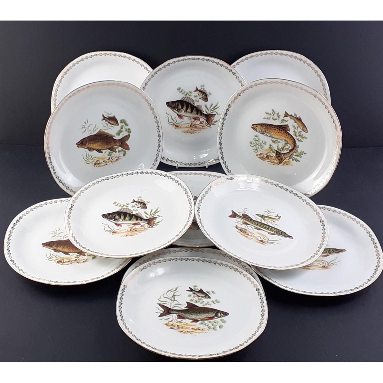 OUEST PORCELAINE. Twelve pretty 23cm plates with various fish designs and gilt edging. All in good clean useable condition.
