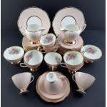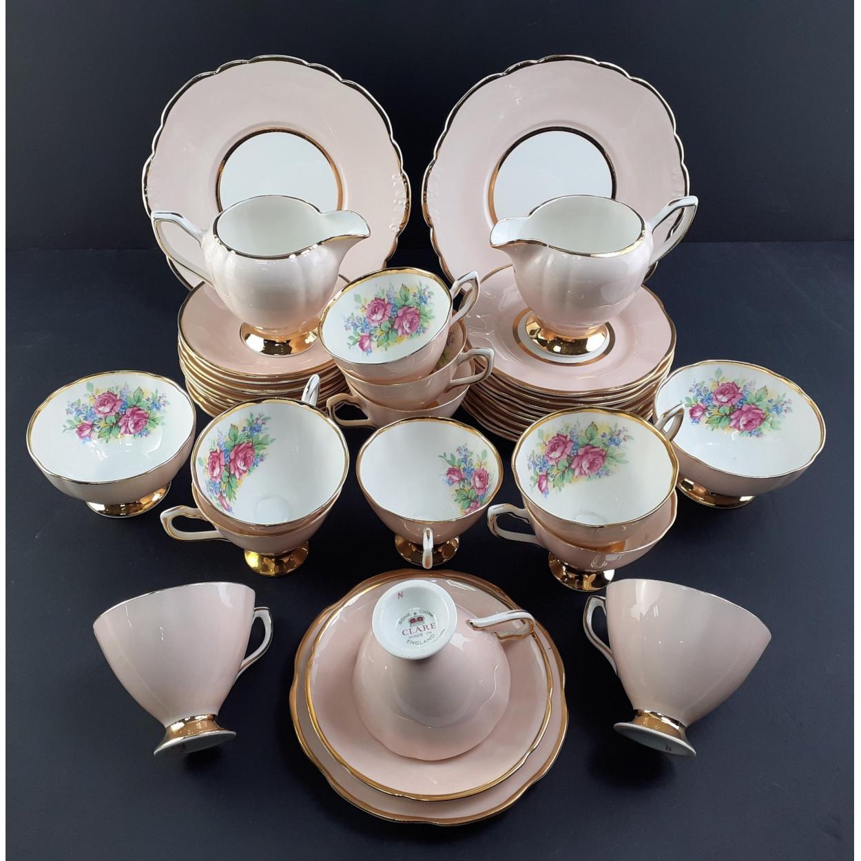 CLARE Bone China blush pink tea service in lovely condition. Comprising Two serving plates, 12 saucers and twelve side plates with eleven cups and two each of sugar and cream. In very good clean condition with no chips or cracks and unrubbed gilt.