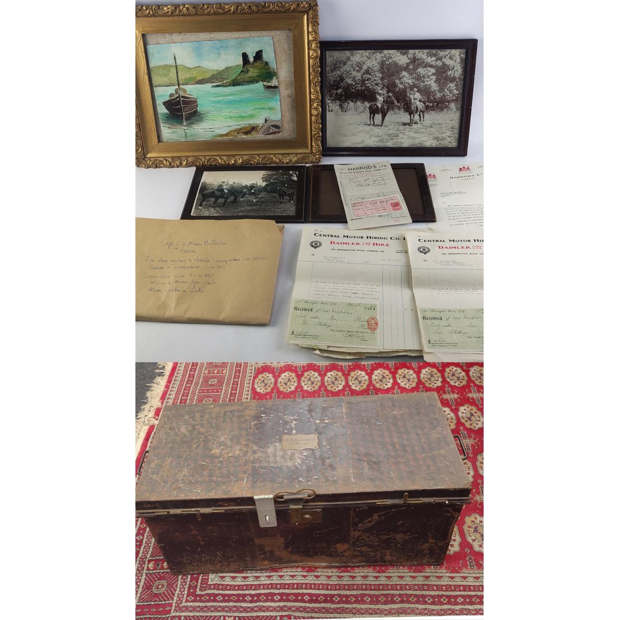 A military tin truck with name plate C.W.M. MacFarlane Esq. 7th Hussars. Comes with invoices and paperwork relating to the hire and purchase of vehicles and purchases from HARRODS in the early 1900s With photos which are believed related. Handy trunk.