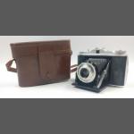An AGFA Isolette folding viewfinder film camera with an Agfa Agnar 85mm f/4.5 lens and a Vario shutter with leather case, in good condition, the bellows appear to be intact.