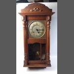 A wooden wall clock with loose pendulum spring and key. Minor issues to face. No makers mark apparent.