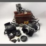 A collection of camera and photographic items. To include a YASHICA ELECTRO 35 in case with Japanese YASHINON DX 1:1.7 45mm Lens. A further case containing a YASHIKOR 1:4 Wide Angle and a YASHIKOR 1:4 Telephoto lens. All lens are internally clear, clean and undamaged. Also includes a cased BOLEX PAILLARD movie camera with accoutrements.