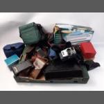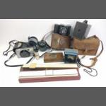 A box containing a POWERMATIC 8 movie camera, a KODAK Six 20 folding camera, a KODAK folding Autographic, a KERSHAW 63 folding camera and a number of camera cases. Lot also includes a Fellowes laminator in a box.