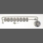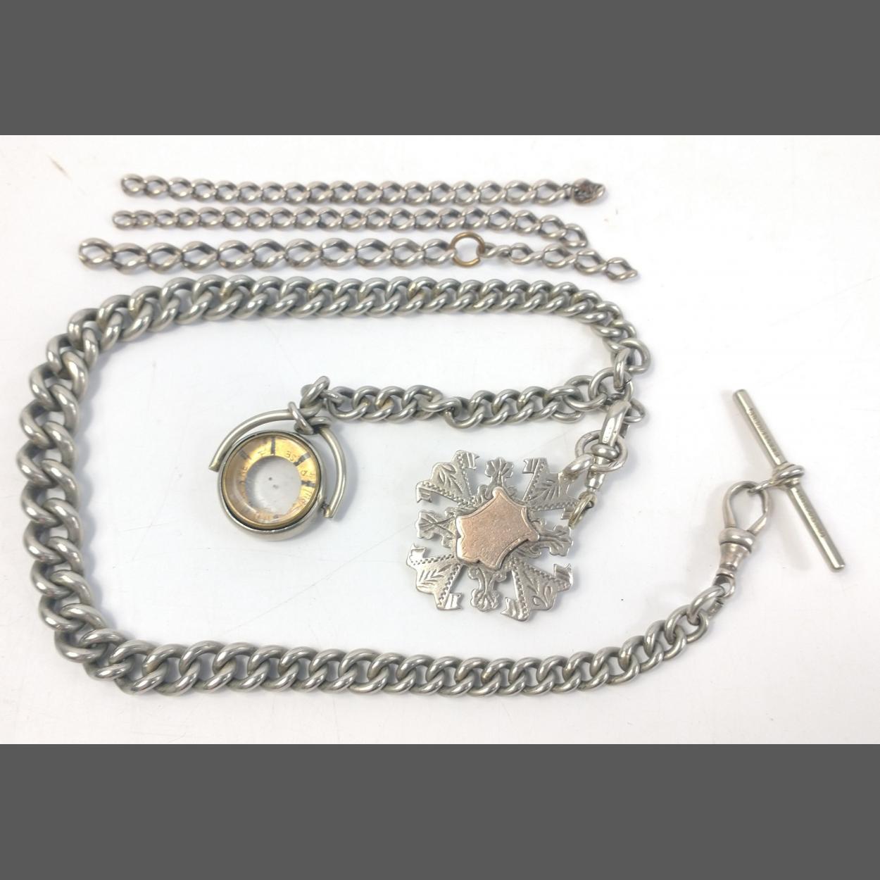 A vintage silver Albert chain, with additional link parts. Lion mark to chain end link. Includes attractive fob with gold shields and an interesting compass fob with indistinct marks. Total weight 83g approx.