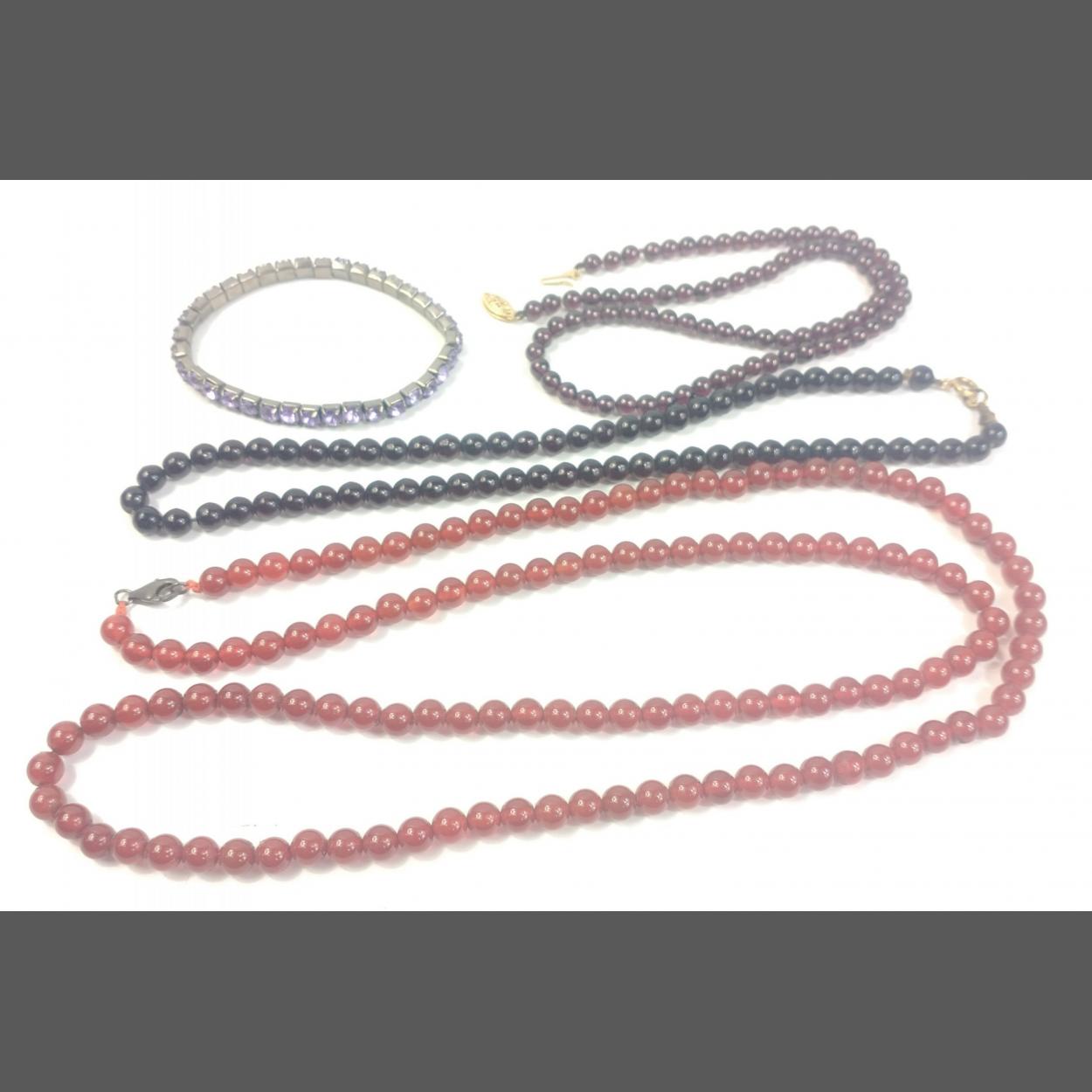 Three sets of VINTAGE coloured beads and an expanding bracelet with purple stone, one set with a lovely quality clasp marked 14K.
