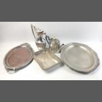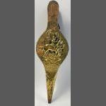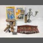 An intriguing lot including an unusual brooch (5cm dia approx) with a yellow metal llama to the centre, plus a white metal bracelet made of 8 sections with elephants and scimitars stamped with a star and crescent to the obverse and a lapel pin of a cute dog