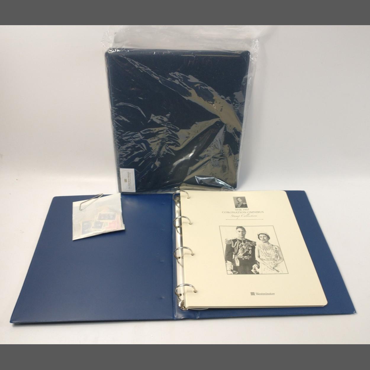 The 1937 Coronation Omnibus stamp collection from Westminster, in a blue album, stamps still to be arranged in folder. Plus a matching unused album