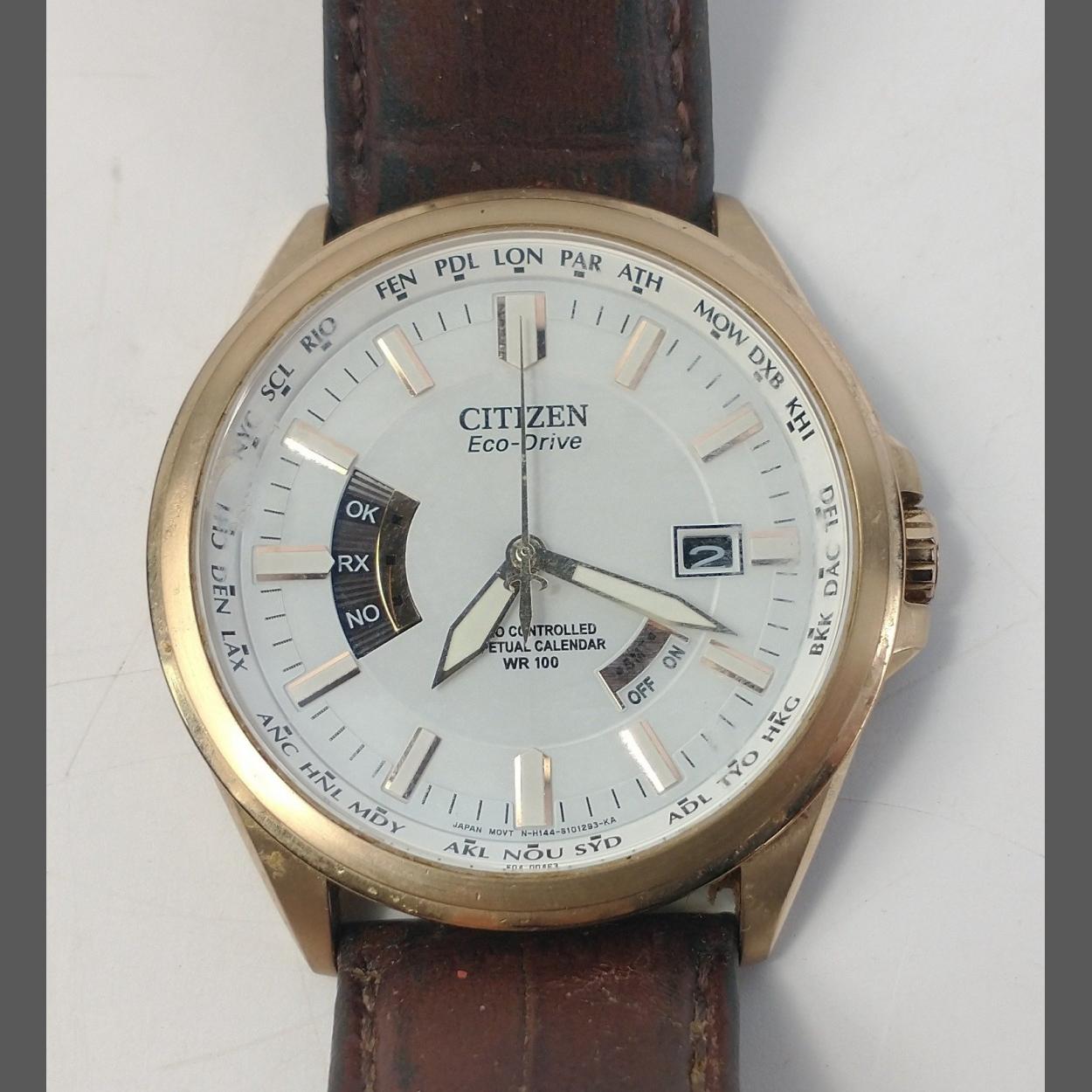 A man's CITIZEN'S Eco Drive watch (H145-S073308 331050051) with leather strap and clear face )
