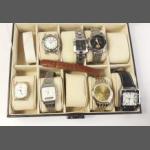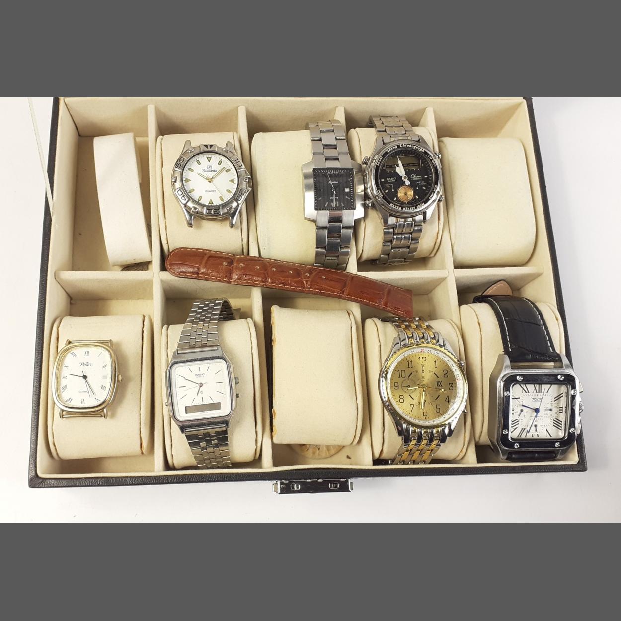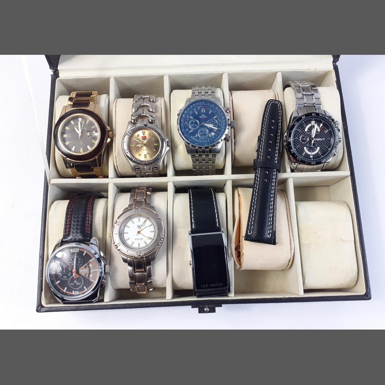 A clear Perspex-lidded display box containing seven men's watches including a PROFESSIONAL SPORT (9240 8866), a BEWELL, a KSSTEE (9106 SR626SW), a ROJAS Aand an LED watch