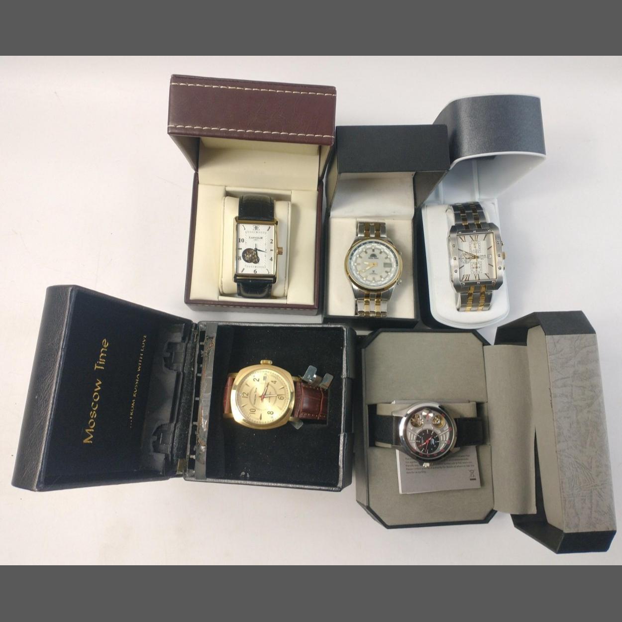 Boxed men's watches to include an EARNSHAW (WB127671 00185832), a SOLAR TIME radio controlled watch, a LORUS (YM-92X185), and a boxed MOSCOW TIME watch (WB120585 00188616), water resistant to 50 metres and a GT PRECISION watch