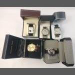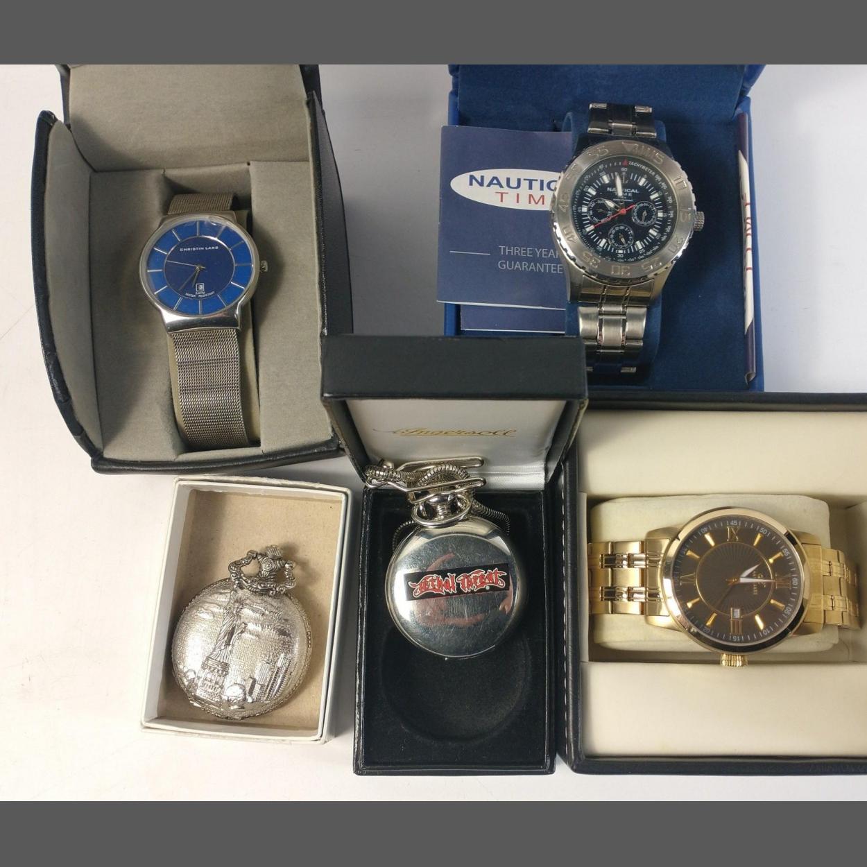 Boxed men's watches to include a KLAUS-KOBEC, NAUTICAL TIME, CHRISTIN LARS, plus a pocket watch with the New York Statue of Liberty and one other Reflex with a Lethal Threat decal