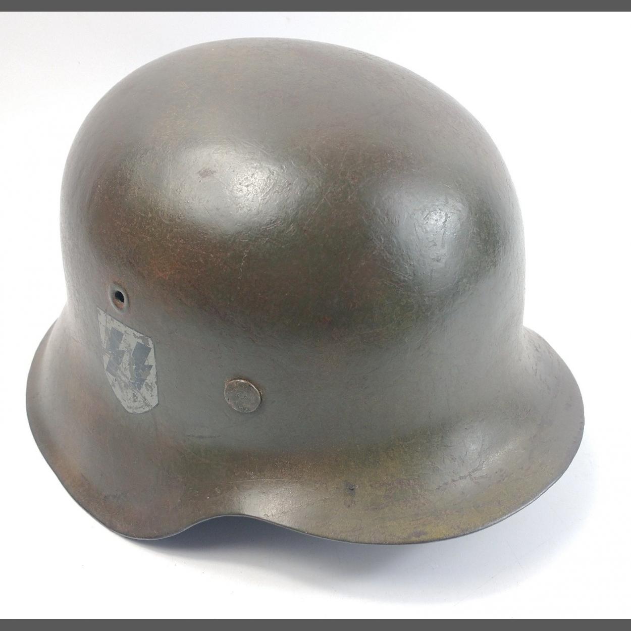 WWII M40 German military helmet with later chin strap and applied SS decal. There is a stamp '1937' on the rear internal flap. Helmet is in good displayable condition.