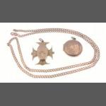 A collection of yellow metal items to include: a chain marked 9K to catch, 51cm long and in good order, weighs 8.9g approx, a gold-plated locket stamped 9ct B&F (back and front) weighing 3.8g approx and a bright cut unmarked yellow metal locket in the form of a Maltese Cross weighing 4.7g approx.