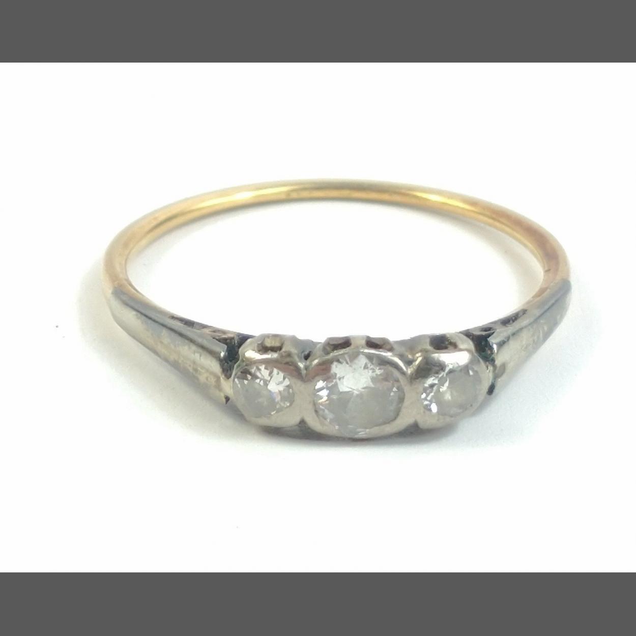 Unmarked yellow metal ring. Size M. Weighs 1.3g approx. Supplied in vintage local jewellers box. Stones test as diamonds. Largest centre stone of the three measures approx 4mm.
