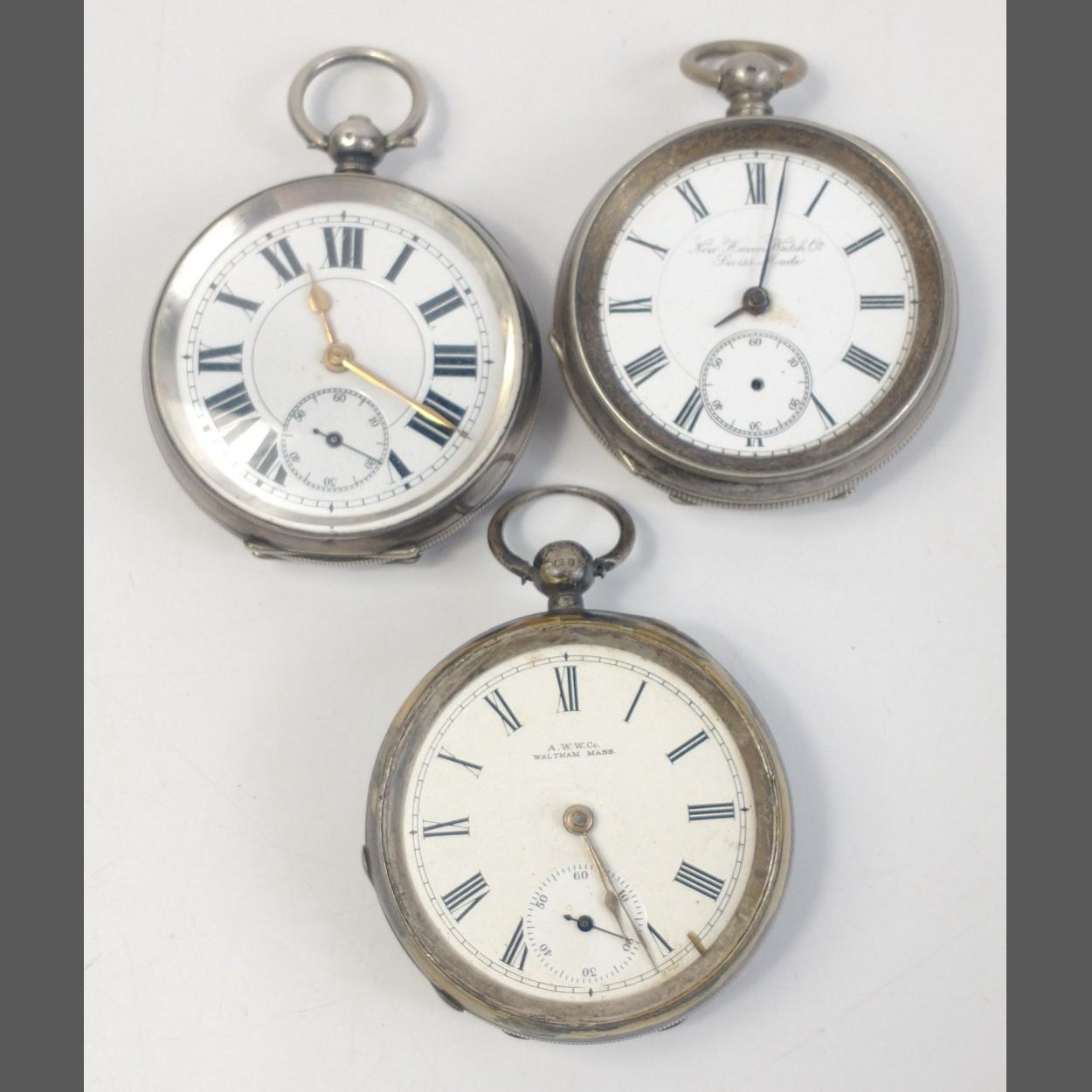 A nice collection of three silver cased fob watches to include: An A.W.W. Waltham with nice signed movement and Birmingham 1898 stamped case, missing glass and not currently running, gross weight 112.7g approx. A New Haven with 0.800 stamped case, missing hands and glass and not currently running, gross weight 85.2g approx. A rather attractive unbranded watch with a 0.935 stamped twin case in good condition but not currently running, gross weight 115g approx.