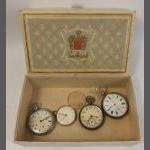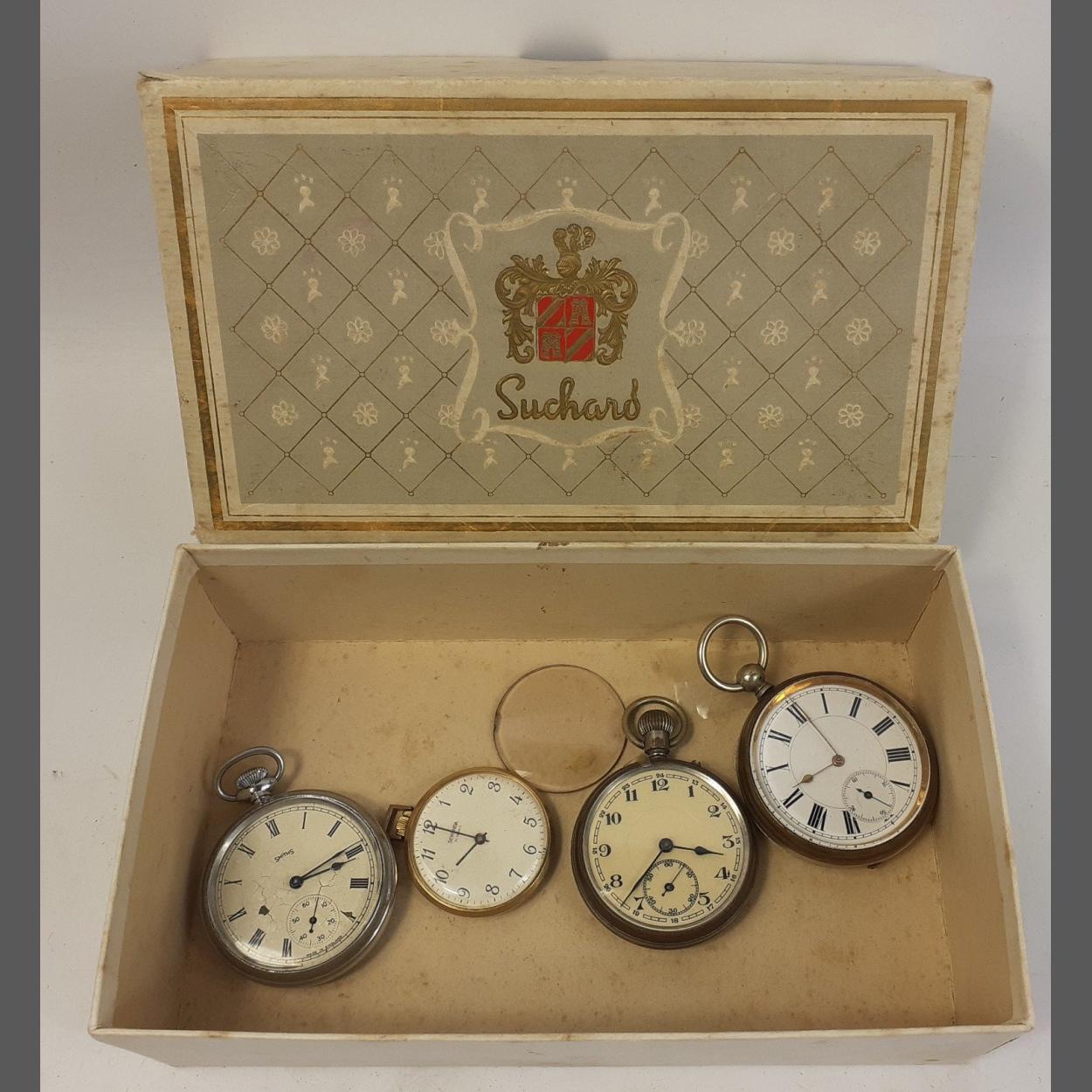 A vintage Suchard chocolate box containing a small collection of four fob watches including a gilt cased Swiss Made 'GLOBE WATCH Co and three others.