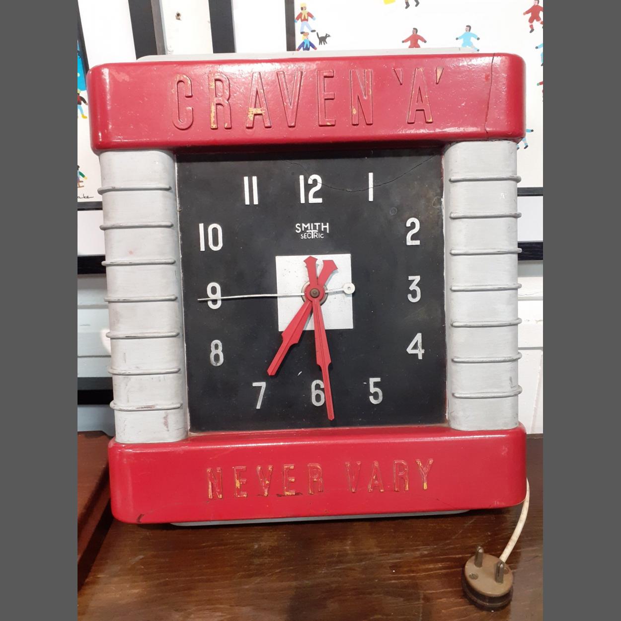 An interesting old CRAVEN A Never Vary Smiths cigarette advertising electric clock. The Bakelite body has been overpainted and has wear and a few cracks from years of use and display. The vendors Grandfather had a small provisions shop in Galashiels. The clock has a two pin plug. Would benefit from a clean and some symphetic restoration, a really appealing old item.