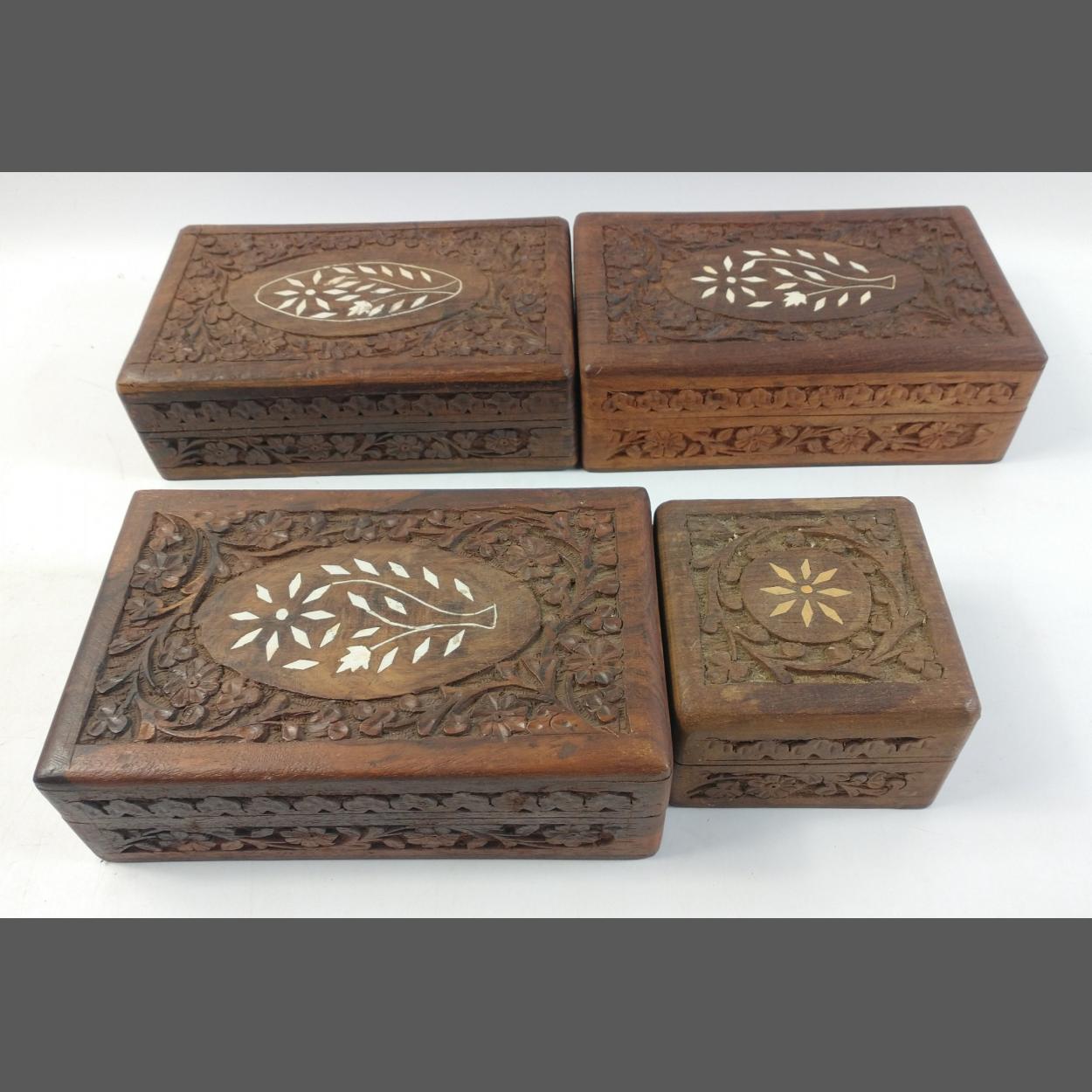 A collection of four hand-carved lidded trinket or jewellery boxes with carved floral design and inlay floral design - 3 larger boxes dimensions 20cm x 12cm x height 7cm and a smaller square one dimensions 10cm square x 67cm height approx