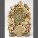 From ARBROATH CERAMICS 1993 - an ornamented quartz mantel clock adorned with cherubs and grapes, stands approx 38cm