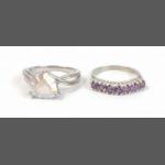 Two silver rings, both stamped 925, one set with 7 amethysts, size M, the other with a crystal stone, size O, gross weight 5.85g