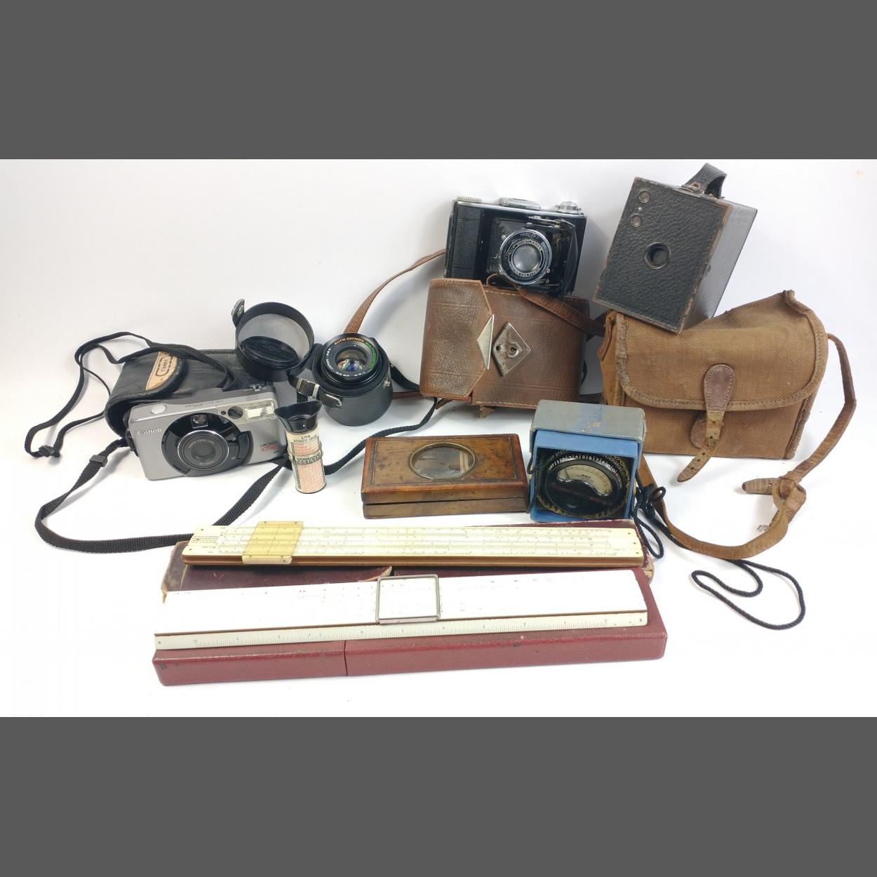 For the vintage camera enthusiast. A box containing a VOIGHTLANDER Bessa 66 ina case, a Bewi Junior Mod II German light meter, a Box Brownie in a case, a CHINON 28mm lens, a boxed GEC Light meter, and a really rather pretty little wooden photo display stand. Lot also includes two boxed mathematical / engineering slide rules.