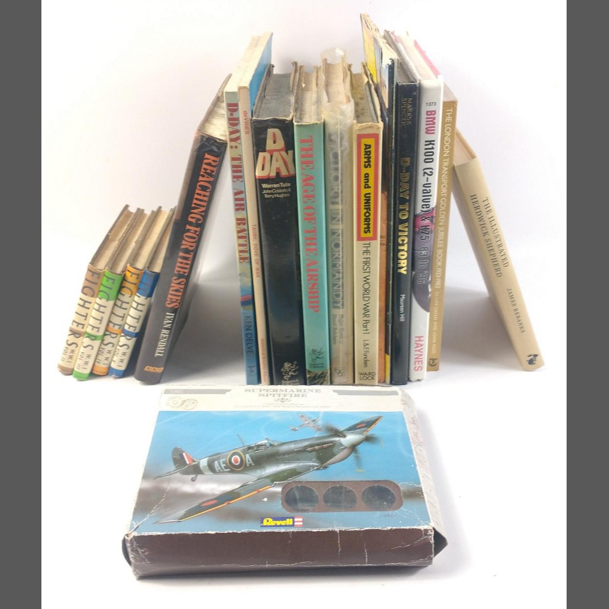 A collection of books on MILITARY HISTORY to include volumes 2 - 5 of WAR PLANES OF THE FIRST WORLD WAR by JM Bruce, TAUBE, DOVE OF WAR by de Vries, D-DAY by Warren Tute, THE AGE OF THE AIRSHIP by Horton, VICTORY IN NORMANY by Belchem, ARMS AND UNIFORMS: THE FIRST WORLD WAR Part 1 by Funcken, plus HAYNES BMW K100 (2-valve) '83 to '92 and an M&S Supermarine Spitfire 1:72 model kit