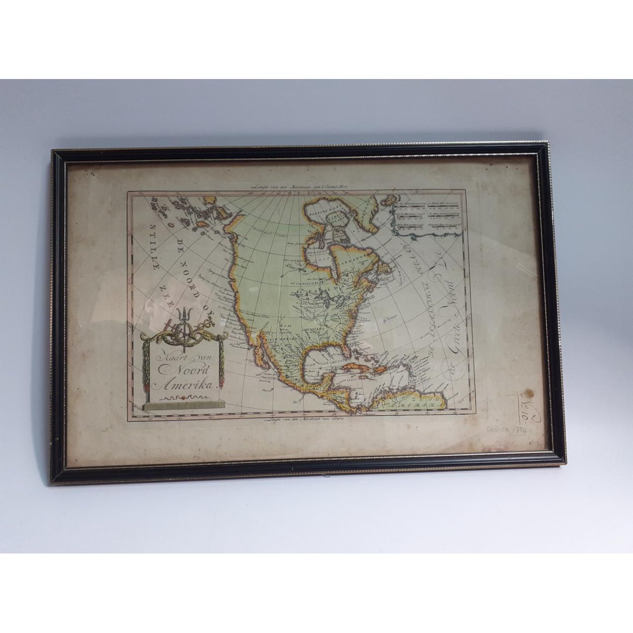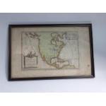 KAART VAN NOORD AMERIKA. A stunning early eighteenth century hand coloured Dutch map of North America. No Cartographer noted. In modern frame measuring 46cm x 30cm approx. Plate marks evident through frame, colours are nice and bright for age. Worthy of further research.