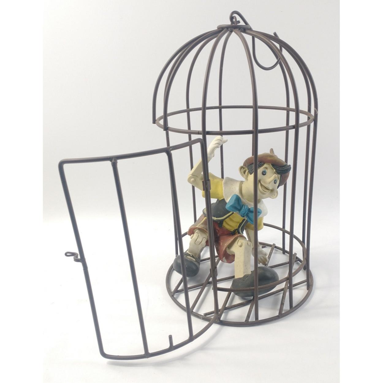 Modern resin DISNEY style Pinocchio model figure within a metal hanging cage - figure dimension 23cm tall approx - cage dimension 38cm tall approx - the item still has the barcode to the base!