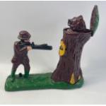A reproduction cast iron mechanical novelty money box of Teddy Roosevelt hunting bear 24cm length approx