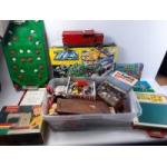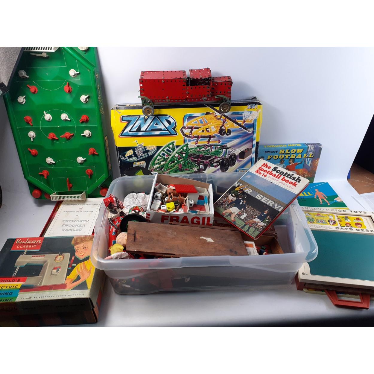 An interesting collection of vintage toys to include a boxed sewing machine, a Lego kit, a built Meccano lorry, a table football kit, a set of snooker balls, and various other super items.