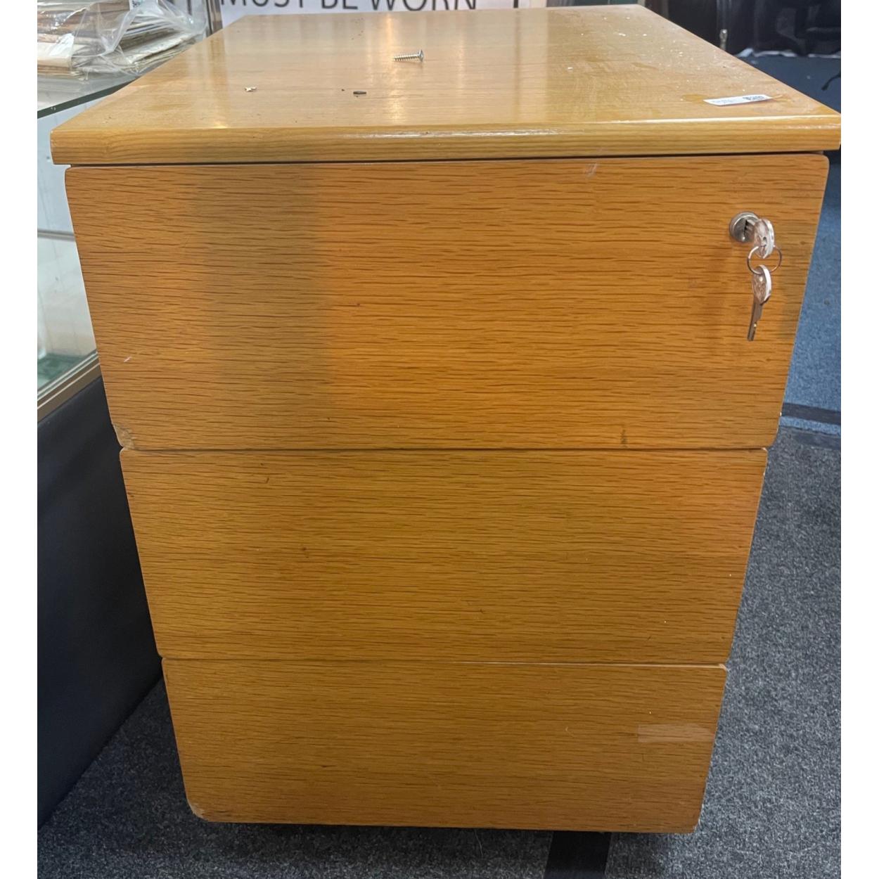 A neat three drawer office set of drawers with keys measuring 58x43x44cm approx