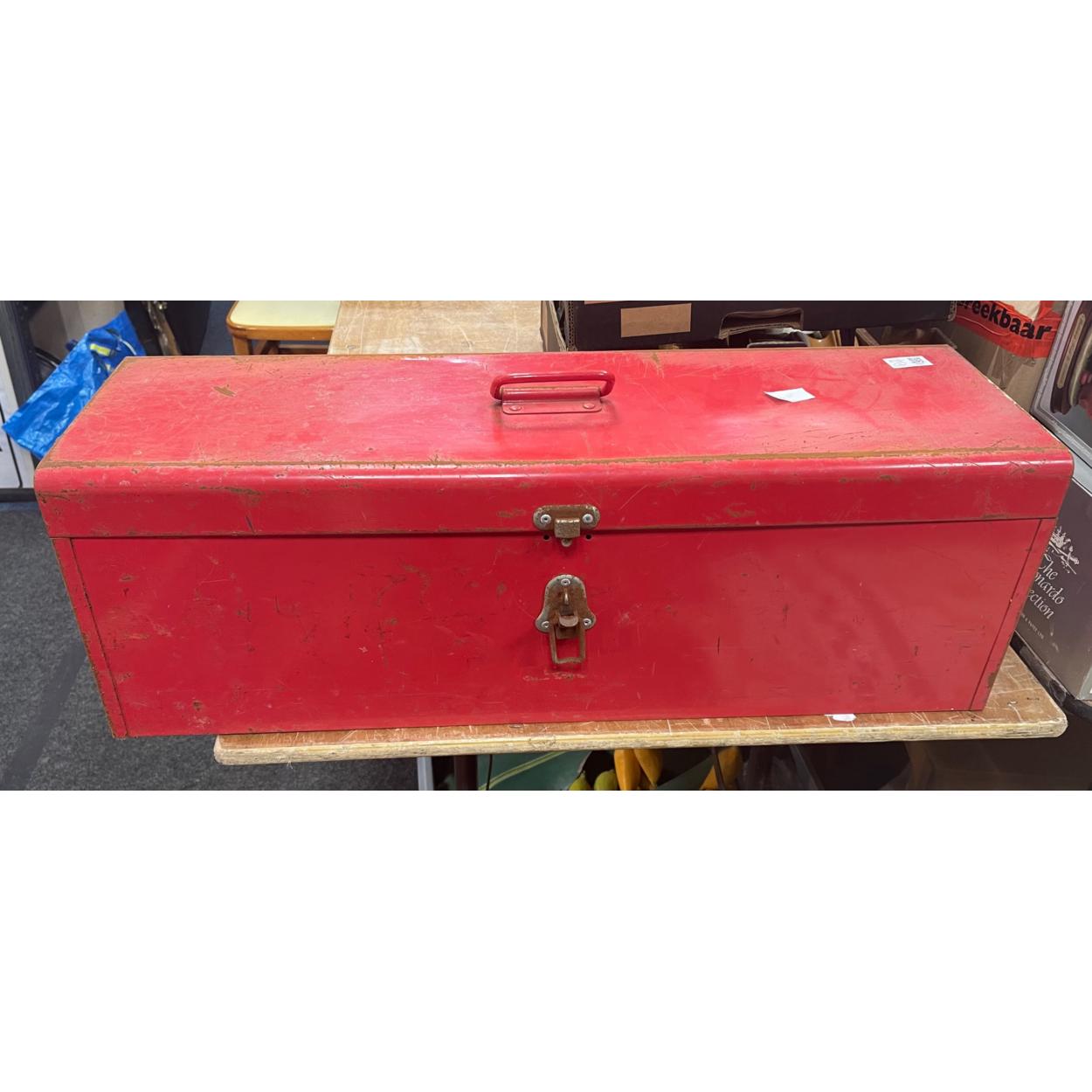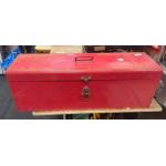 A large red toolbox with a internal shelf measures 76x25x26cm approx
