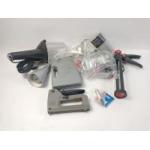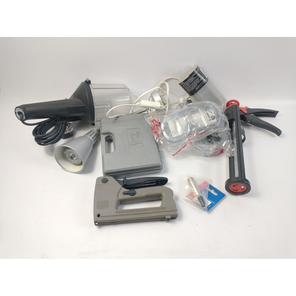A mixed lot of tools including an inspection lamp, a set of Power Devil bits, a staple gun, 2 pairs of safety glasses etc
